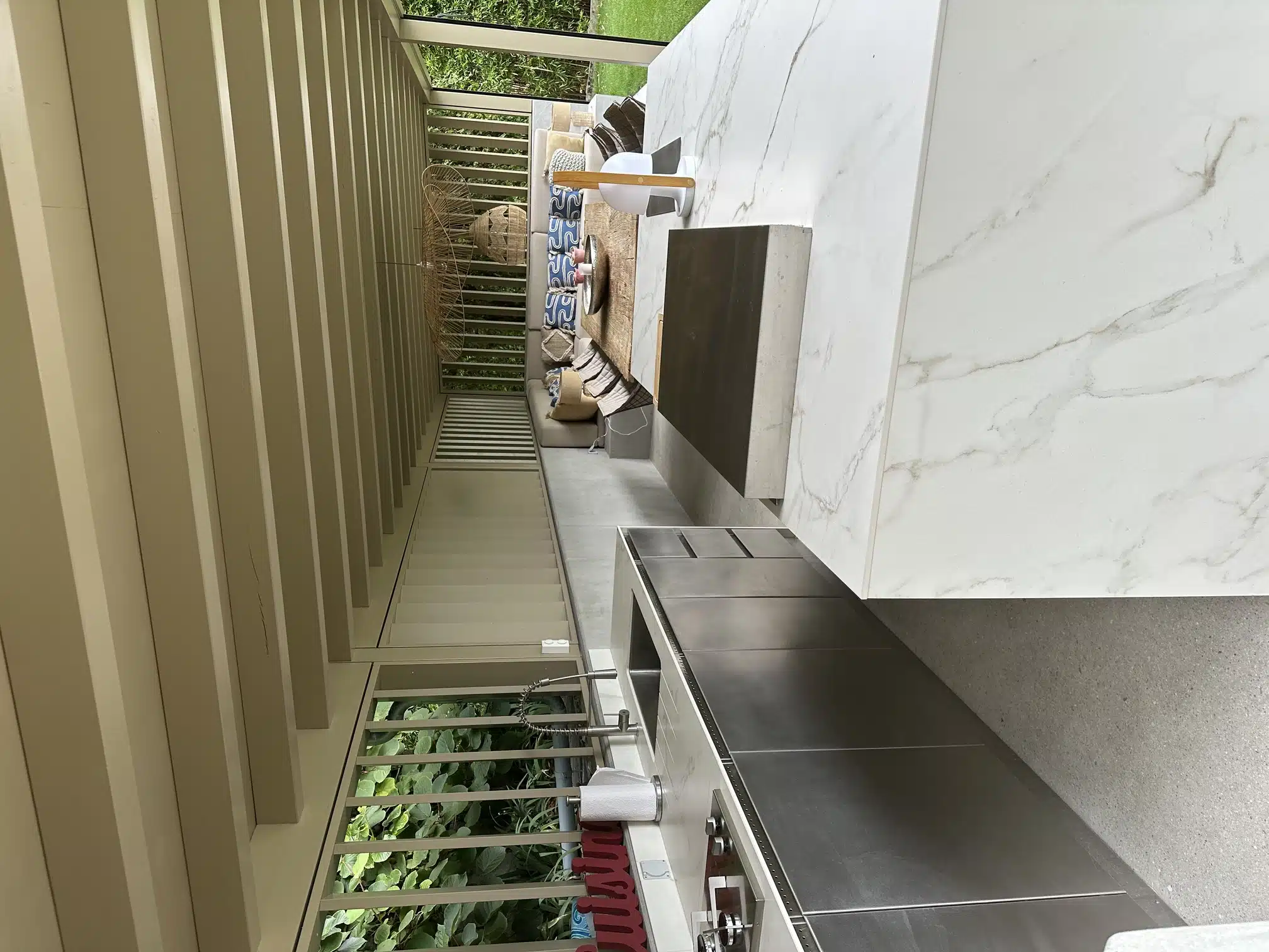 La céramique offre une esthétique minérale et contemporaine particulièrement adaptée aux aménagements extérieurs. Utilisée pour les plans de travail, les crédences ou les habillages, elle apporte une finition élégante et intemporelle.